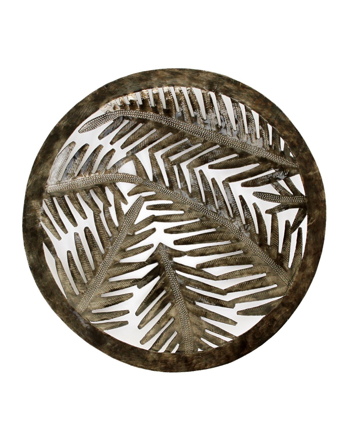 The Palm Bowl Metal Art?is ideal for a basket wall focal point or a centerpiece on your dining table.? Each piece is cut. chiseled and hammered by hand by metal artisans in Haiti.? The amazing detail in this piece will have your guests talking!